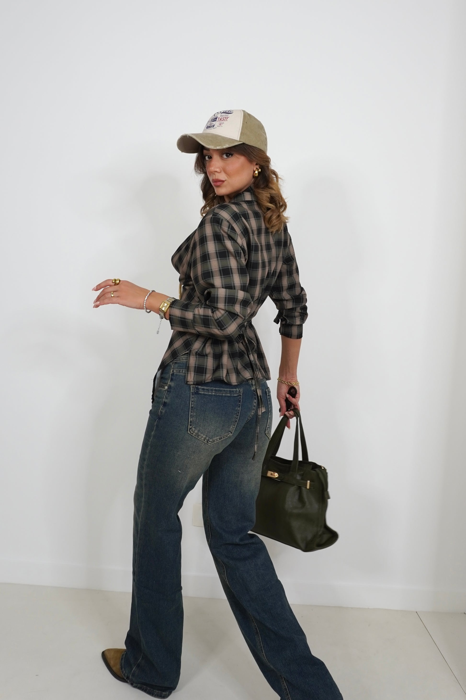 Jeans a vita bassa sabbiato in tela elasticizzata.
