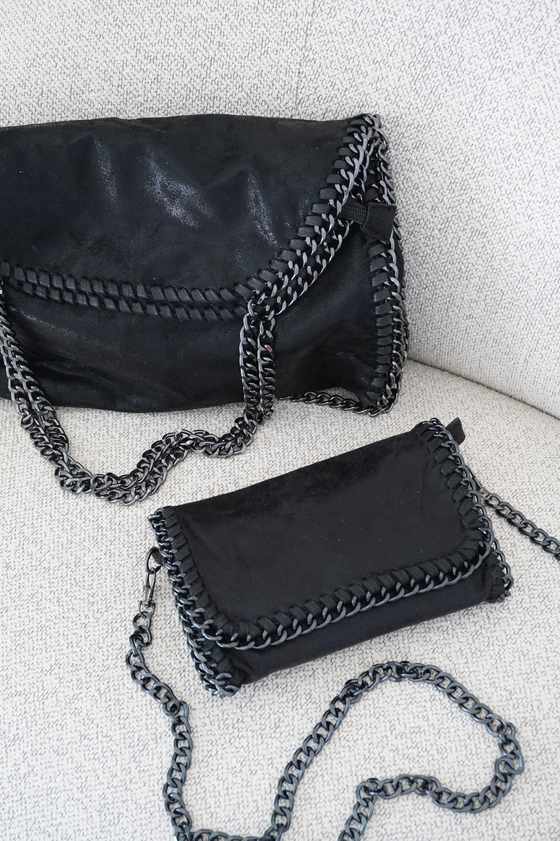 Borsa a busta mini effetto suede martellato lucido con catena piombo.