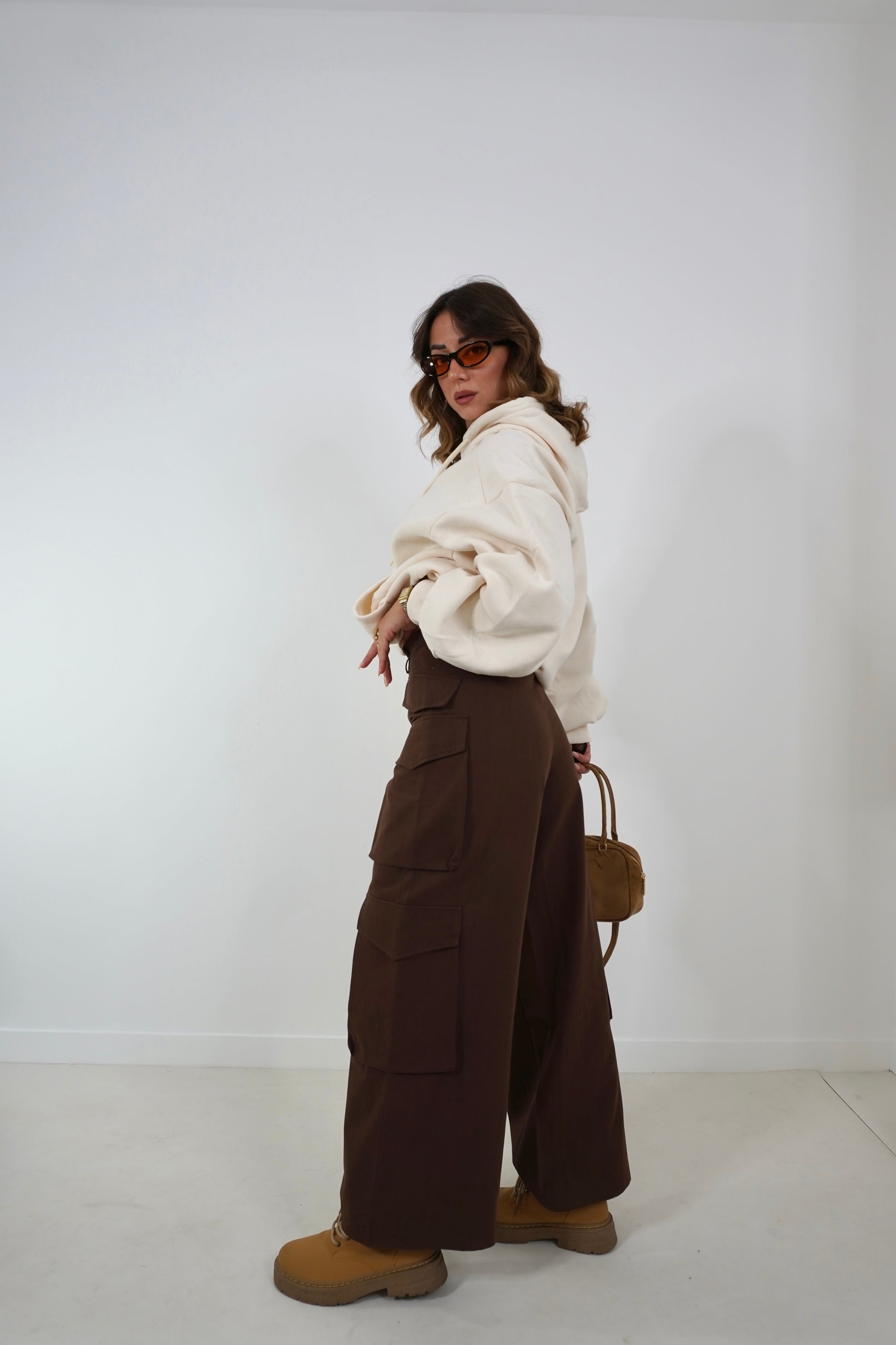 Pantalone a palazzo cargo con elastico nella parte posteriore.