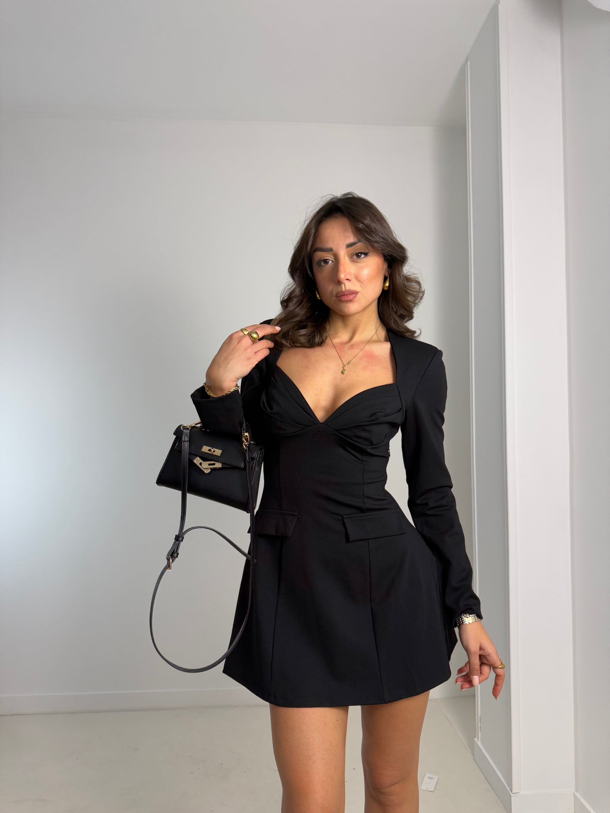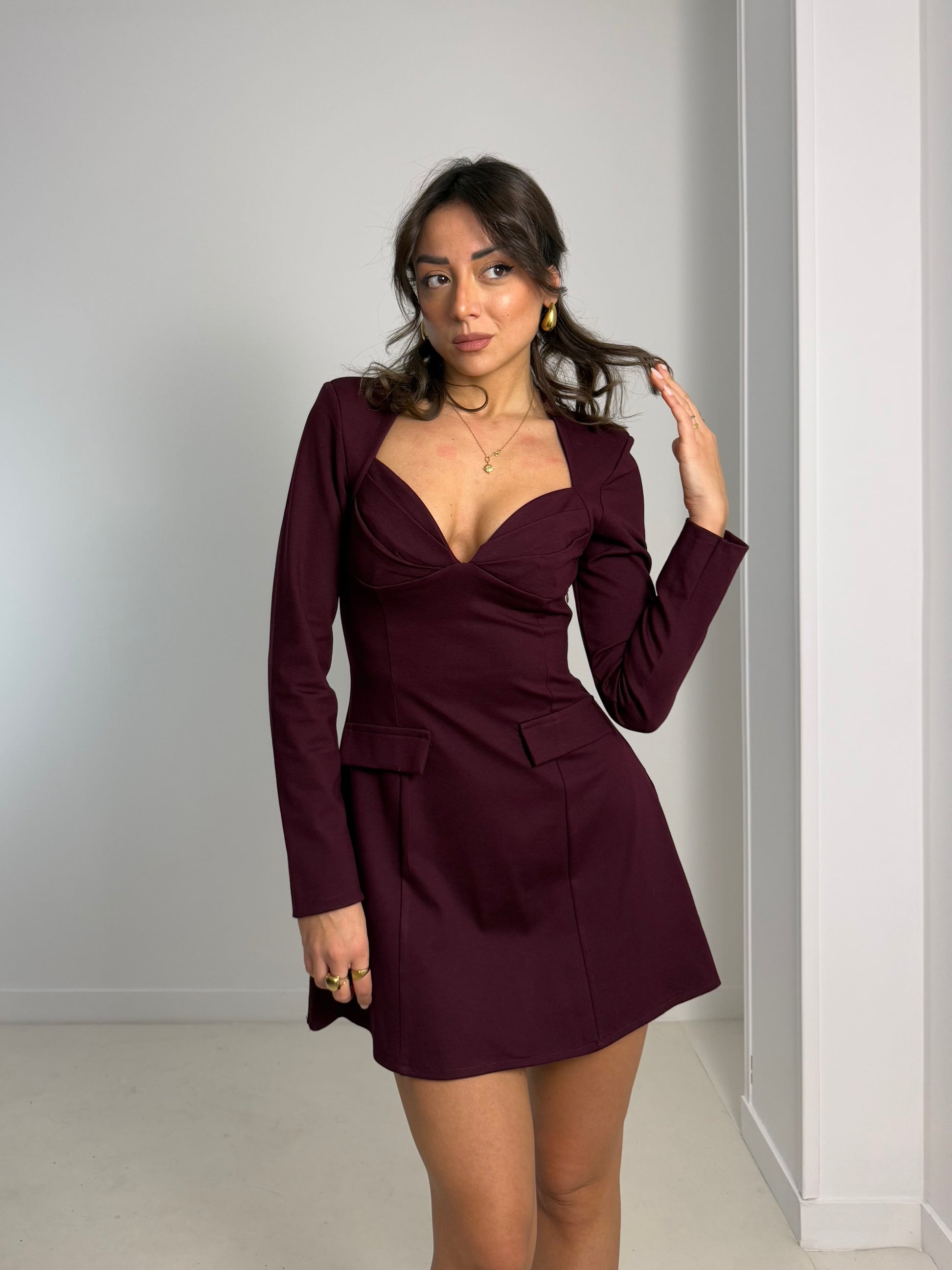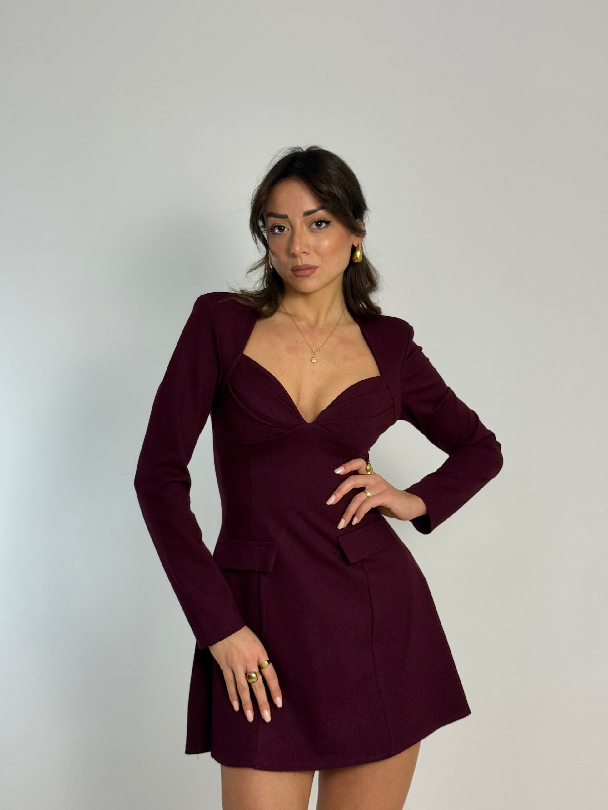 Abito a manica lunga con scollo a cuore e coppa a conchiglia in tessuto punto Roma elastico. Linea ad A.