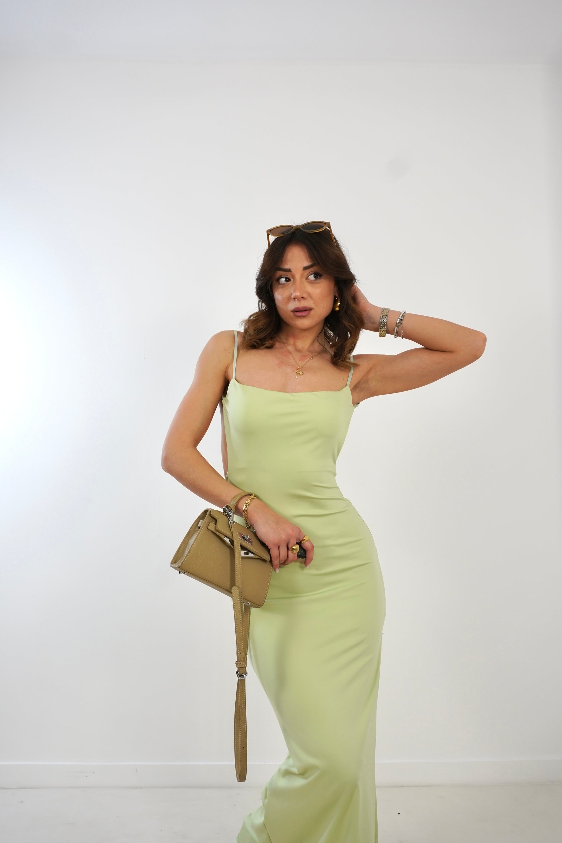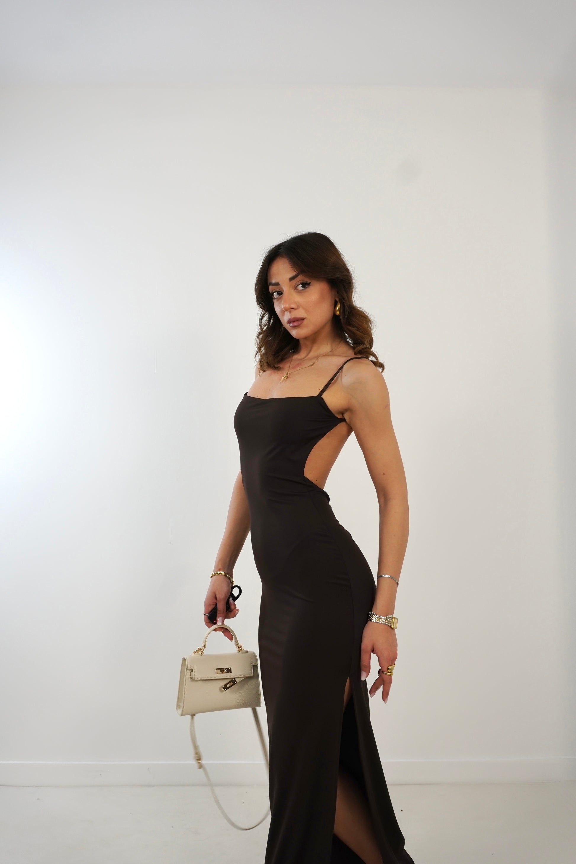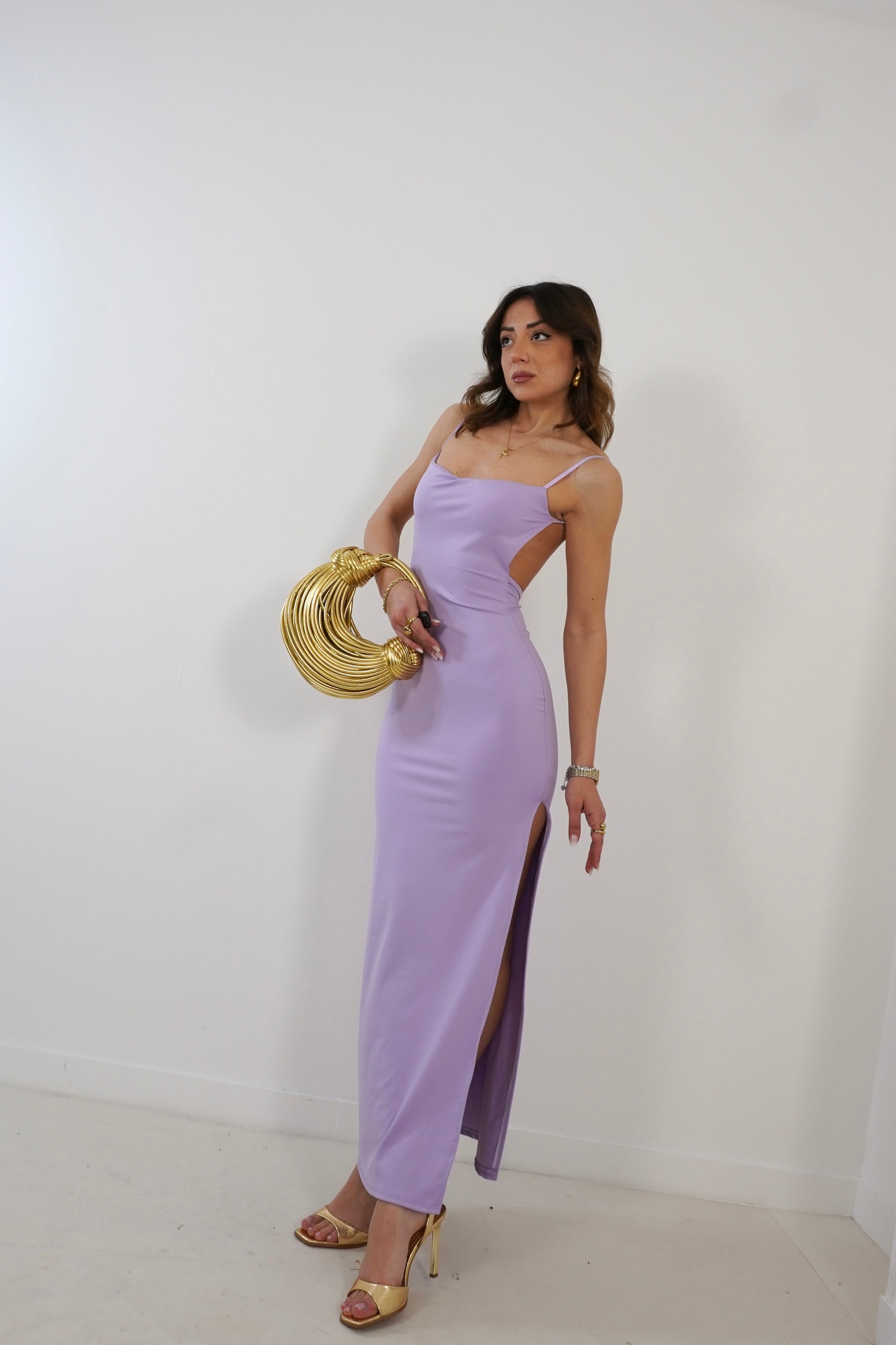 Abito longuette con scollo quadrato e schiena scoperta. Bretelle regolabili e arricciatura sullo scollo posteriore. Spacco laterale.