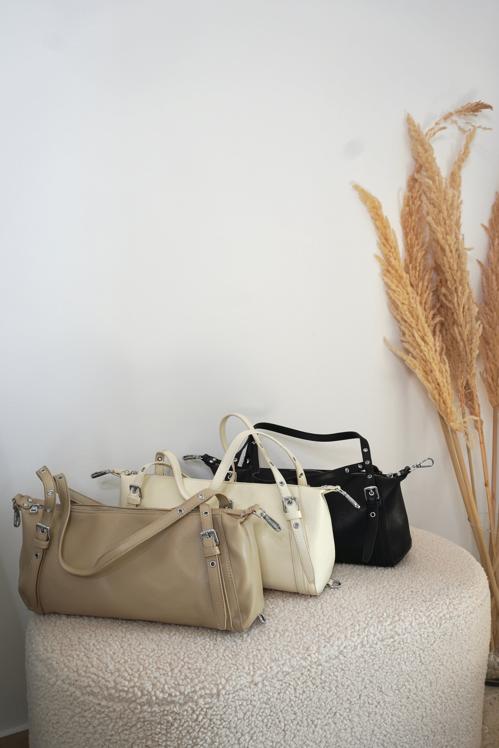 Borsa a spalla in pelle liscia morbida con fibbie regolabili.