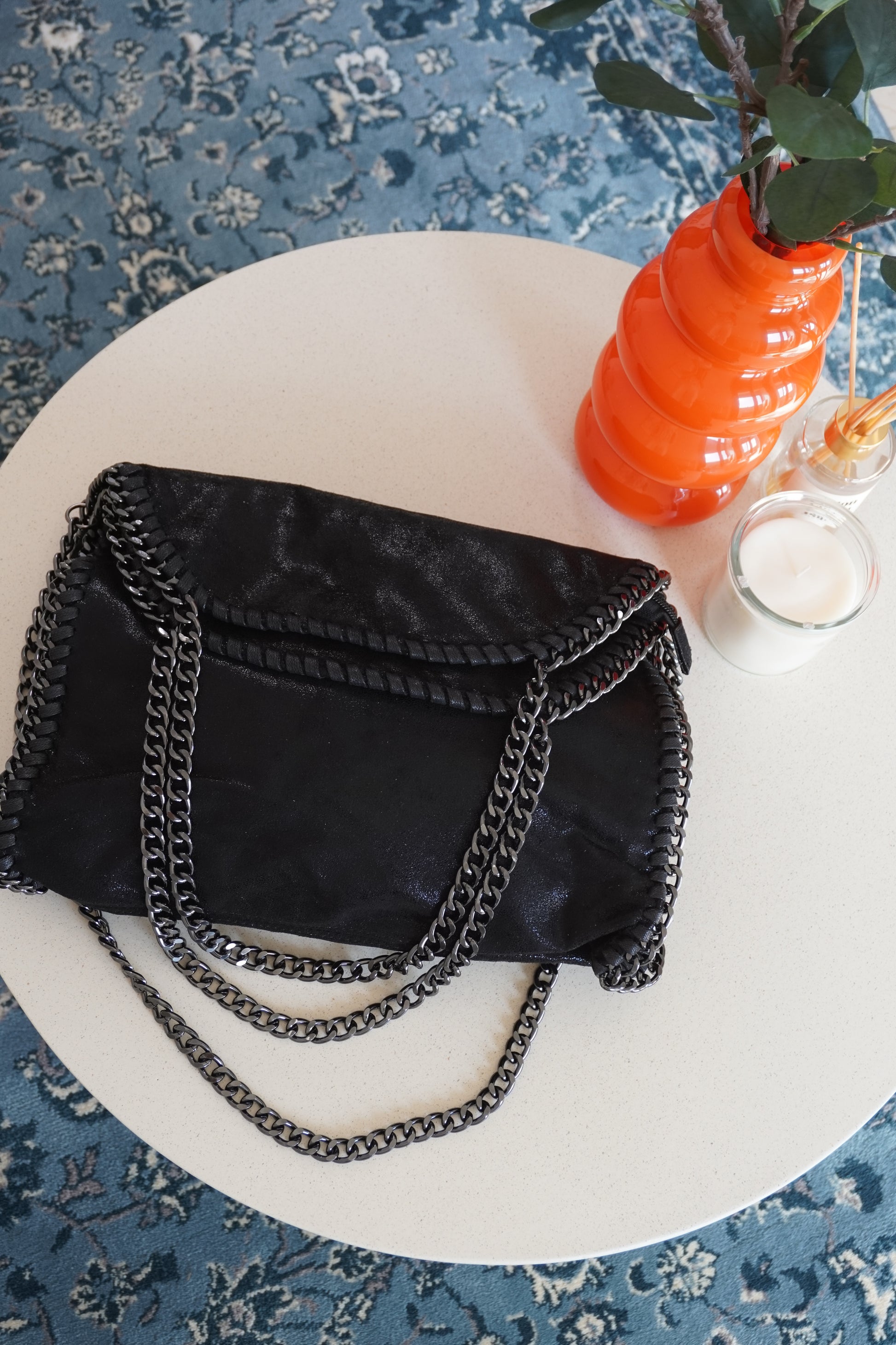 Borsa grande effetto suede lucido con catene piombo, da indossare al braccio, a tracolla o a spalla.