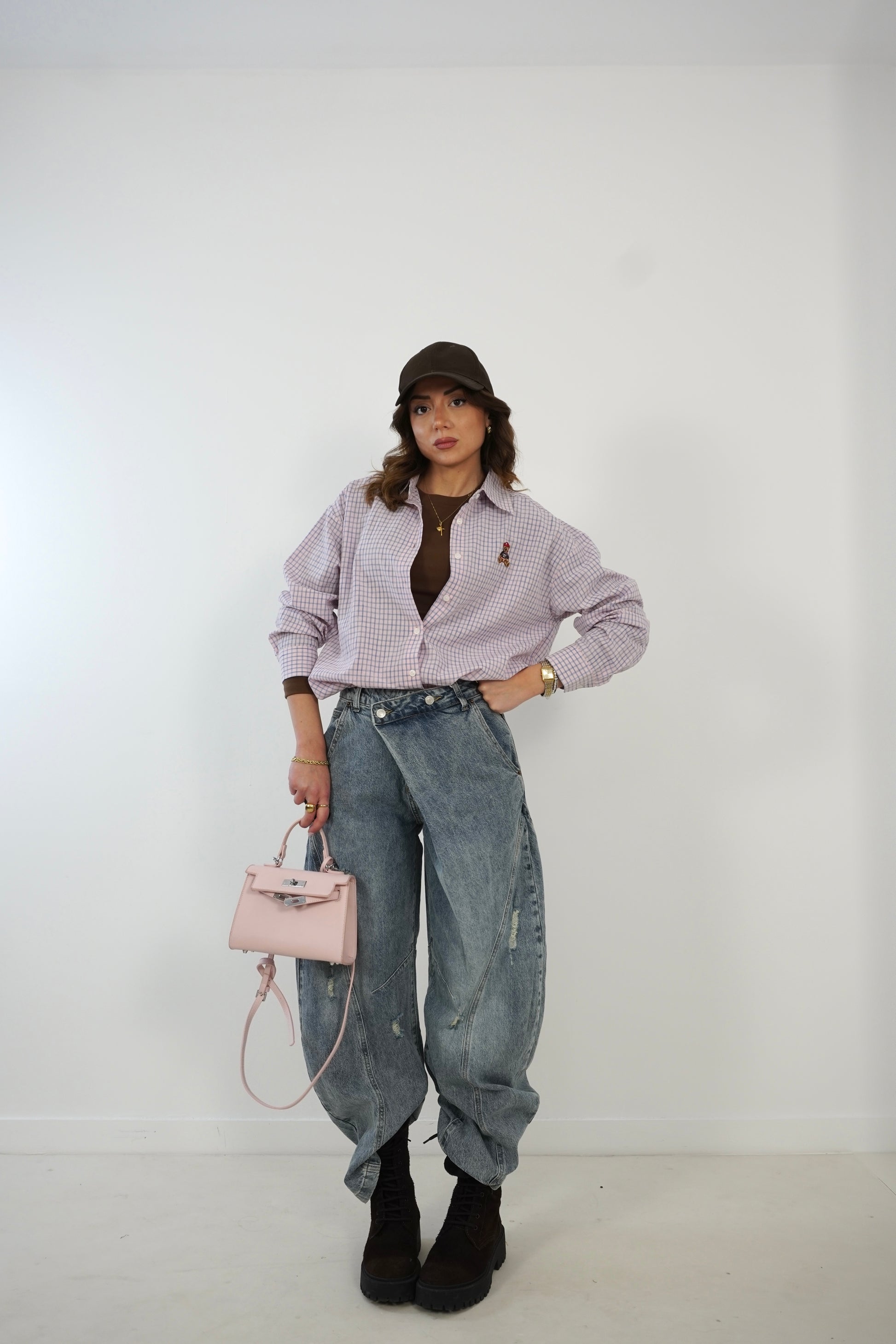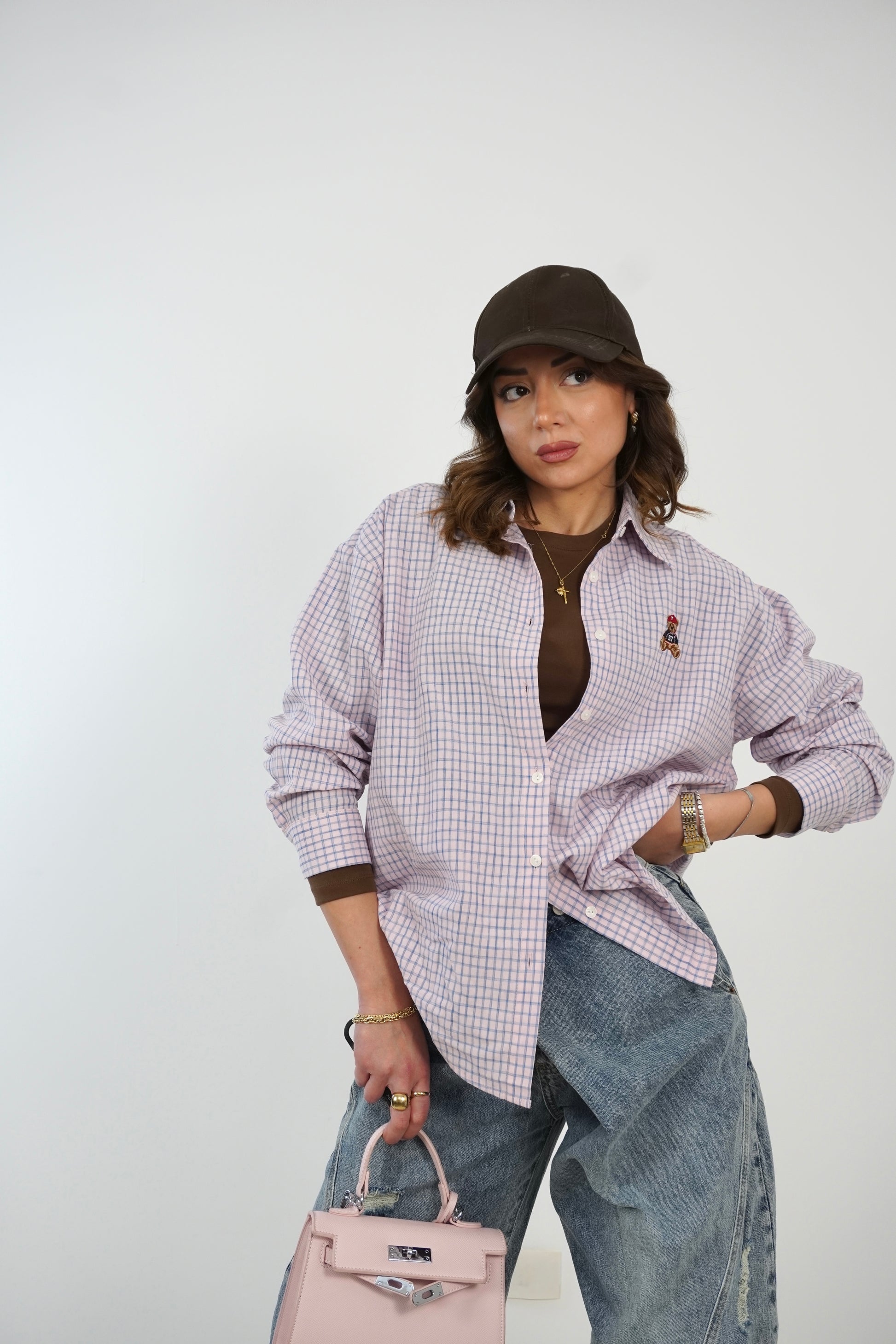 Camicia semi over a quadretti con patch di orsetto.