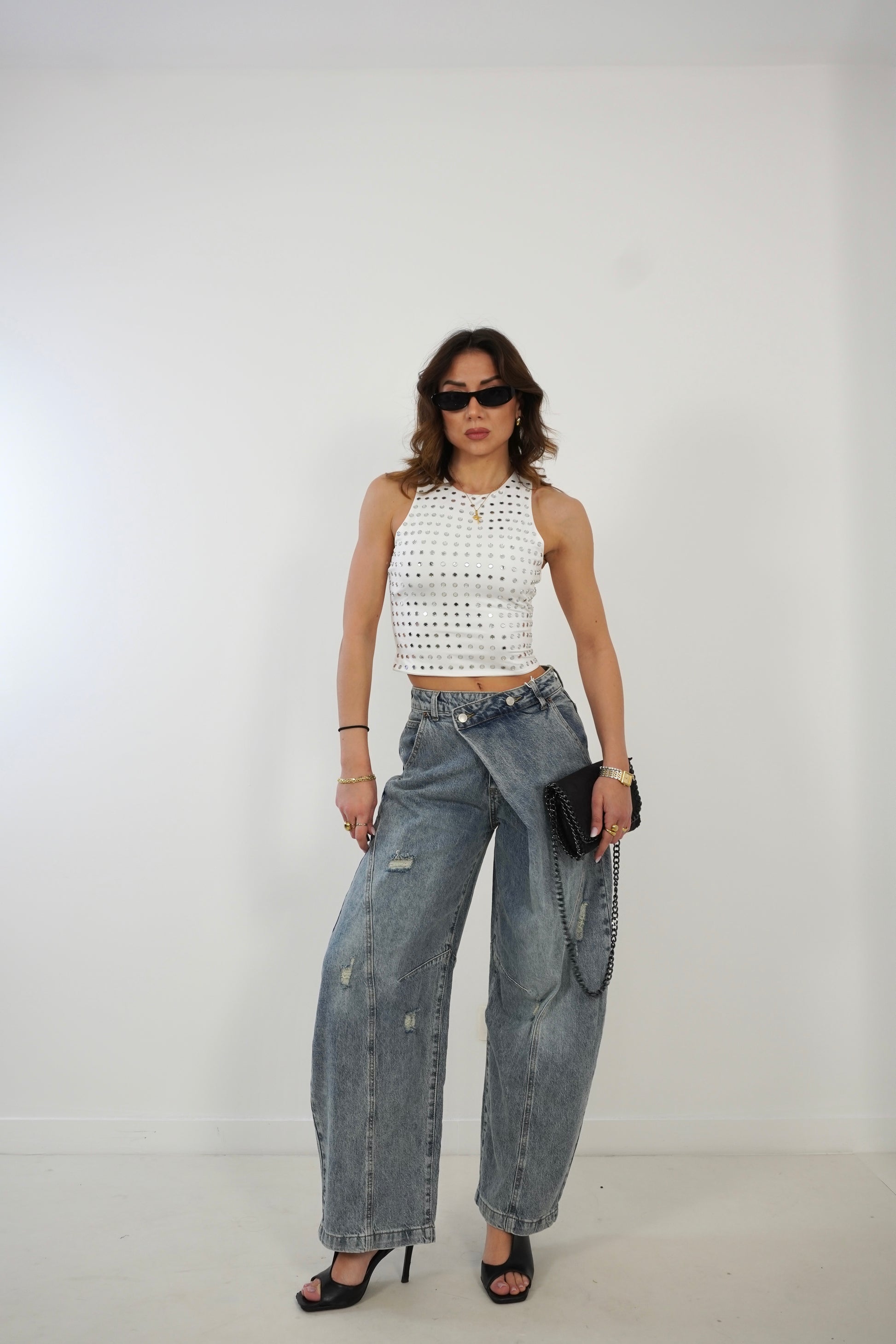 La modella é alta 1.73 e indossa generalmente S. Dei jeans/pantaloni/gonne in tela ELASTICA indossa taglia XS/38it/34eu. Dei jeans/pantaloni/gonne in tela RIGIDA indossa S/40it/36eu.