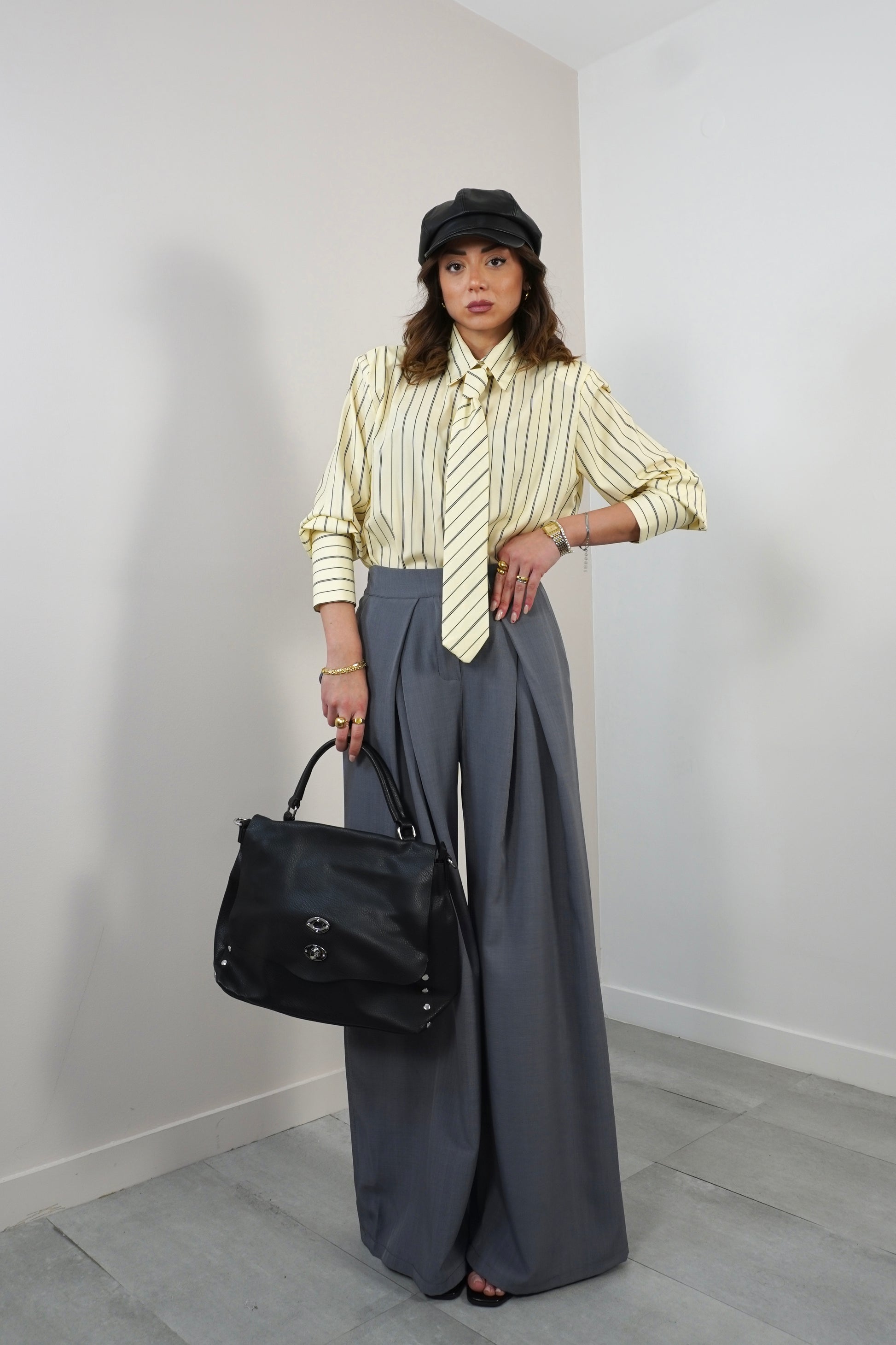 Camicia con cravatta tono su tono gessata. Spallina built in e polsino ampio.
