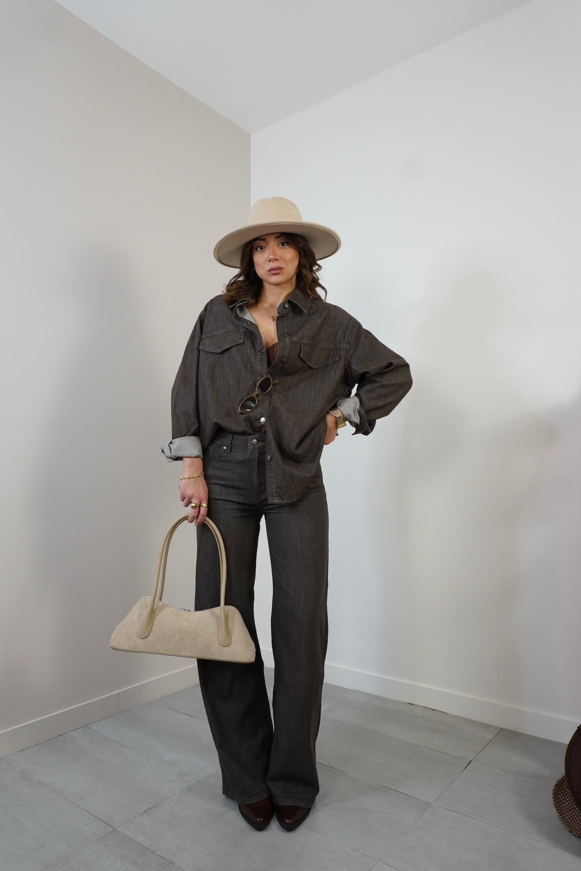 Camicia in denim semi over elastico color caffè.