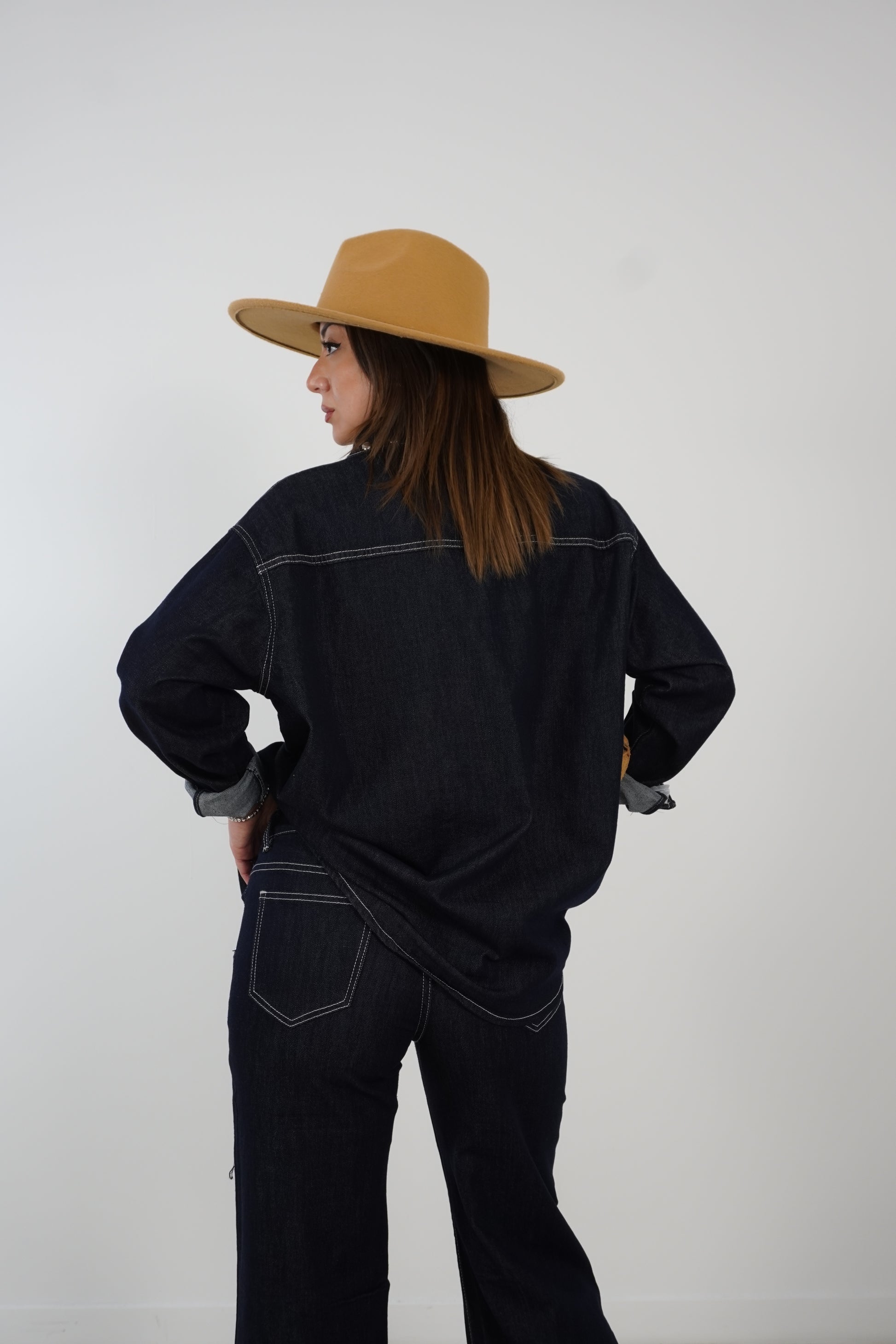 Camicia lavaggio zero con profili del colletto e tasca applicata ricoperti di borchie argentate.