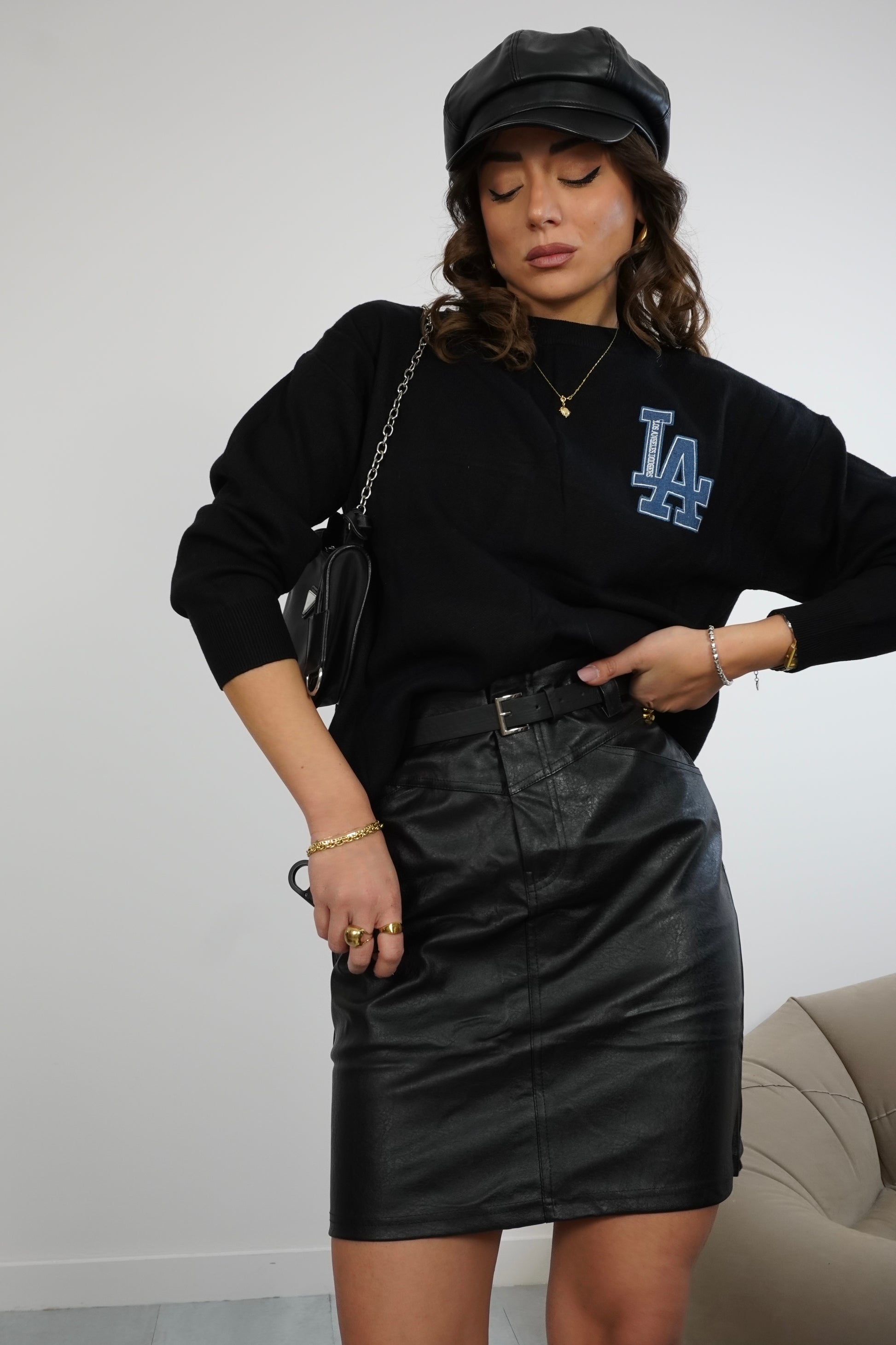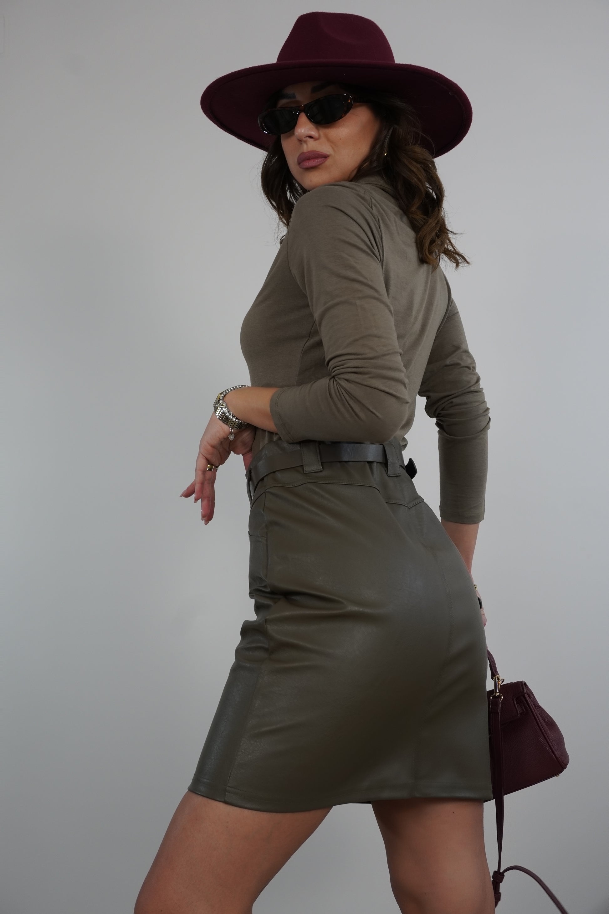 Gonna in pelle a tubino con cintura.