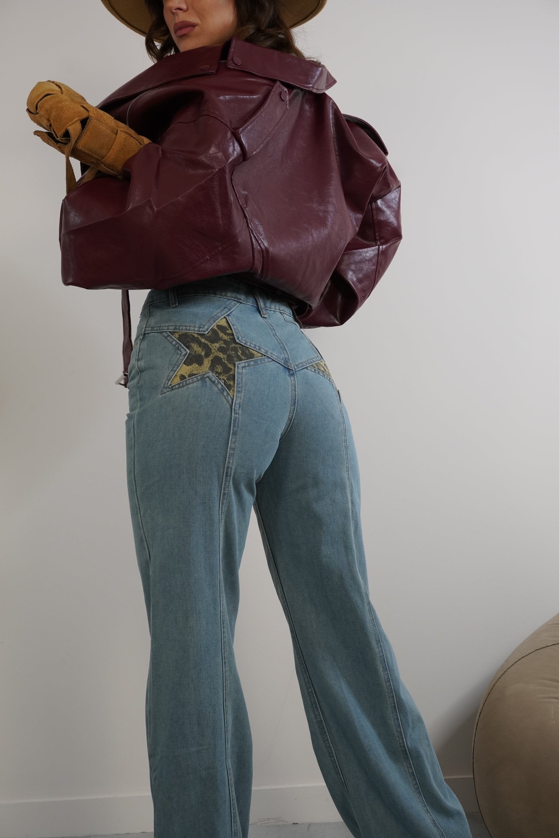 Jeans a palazzo in tela rigida con stelle leopardate sulla parte posteriore.