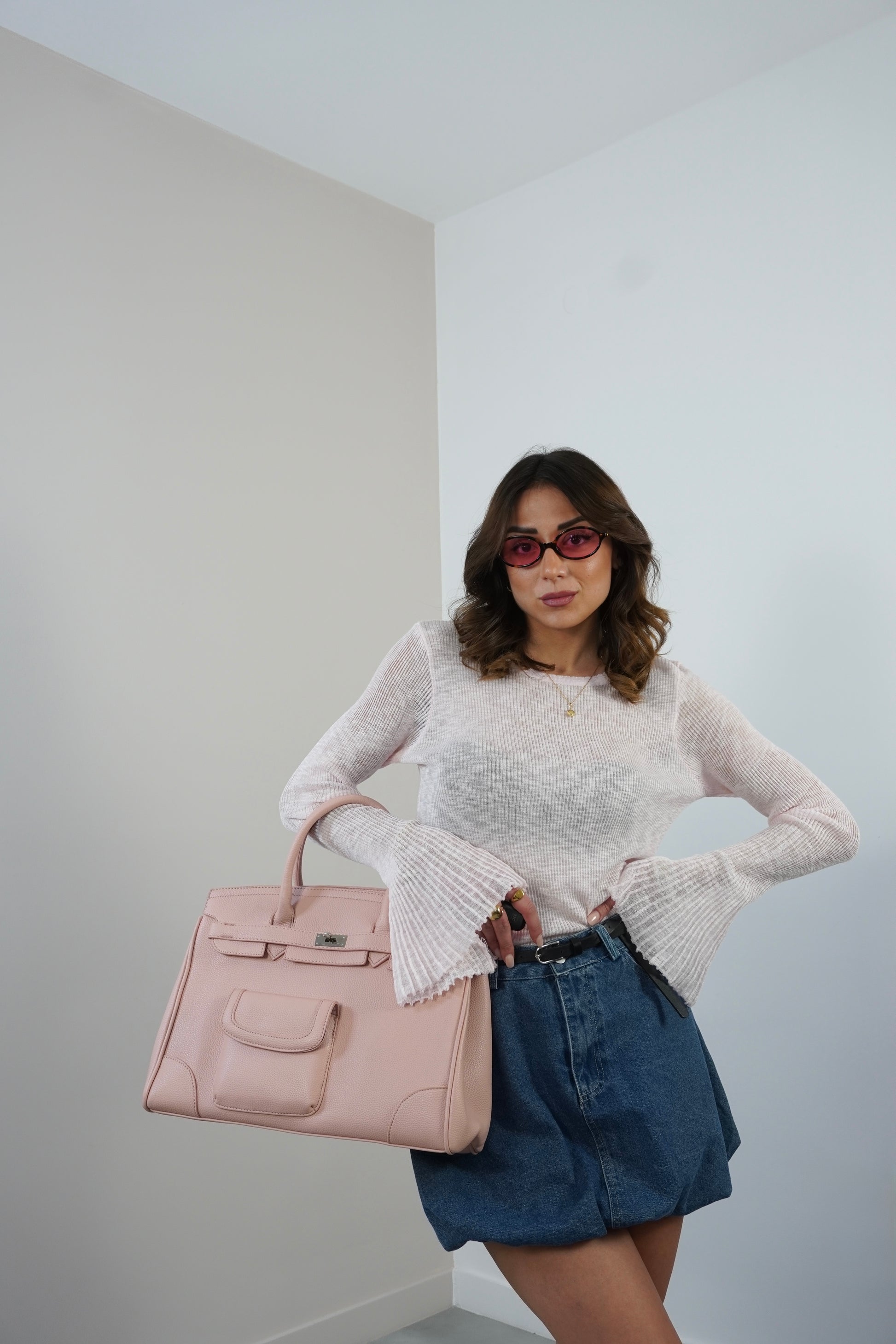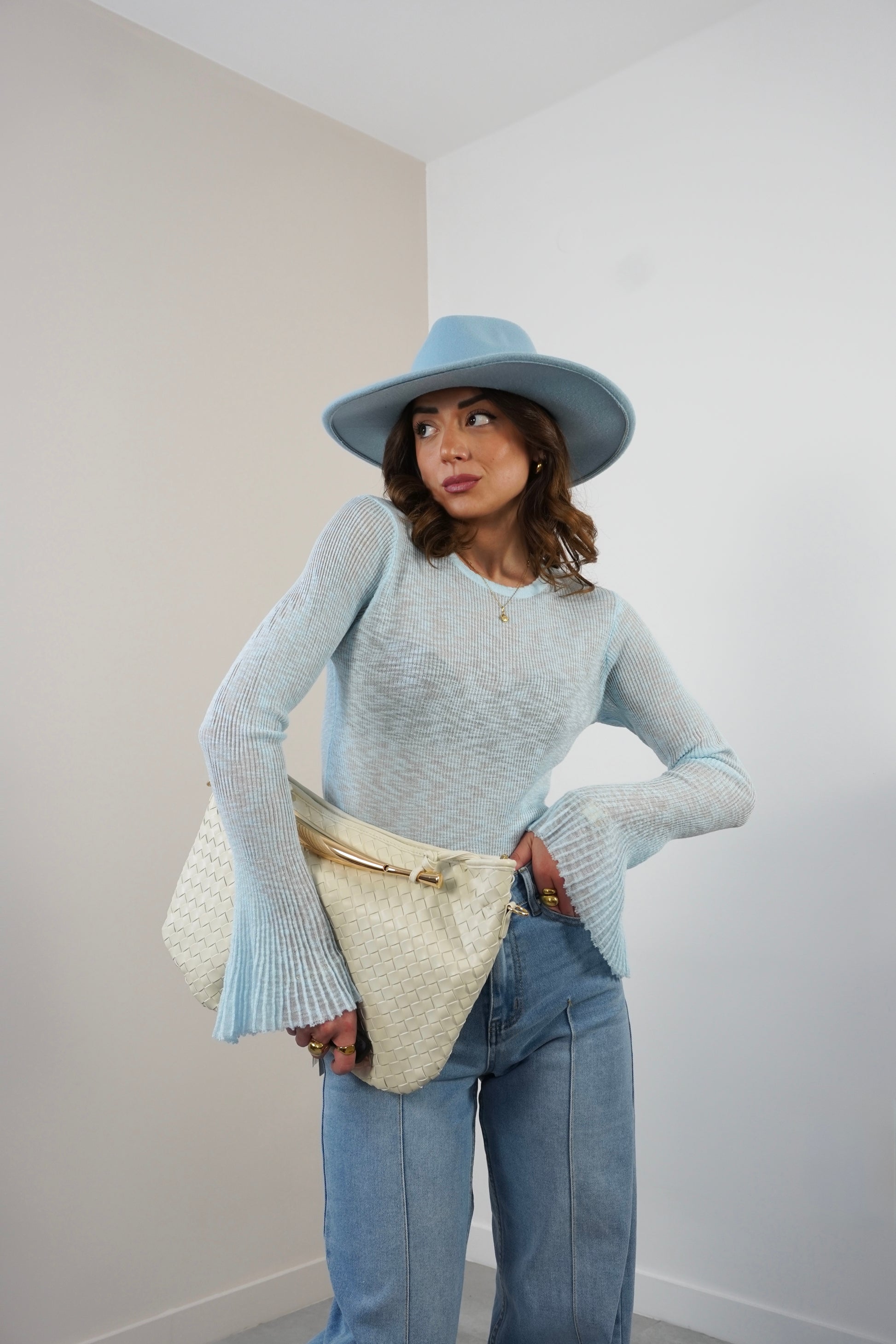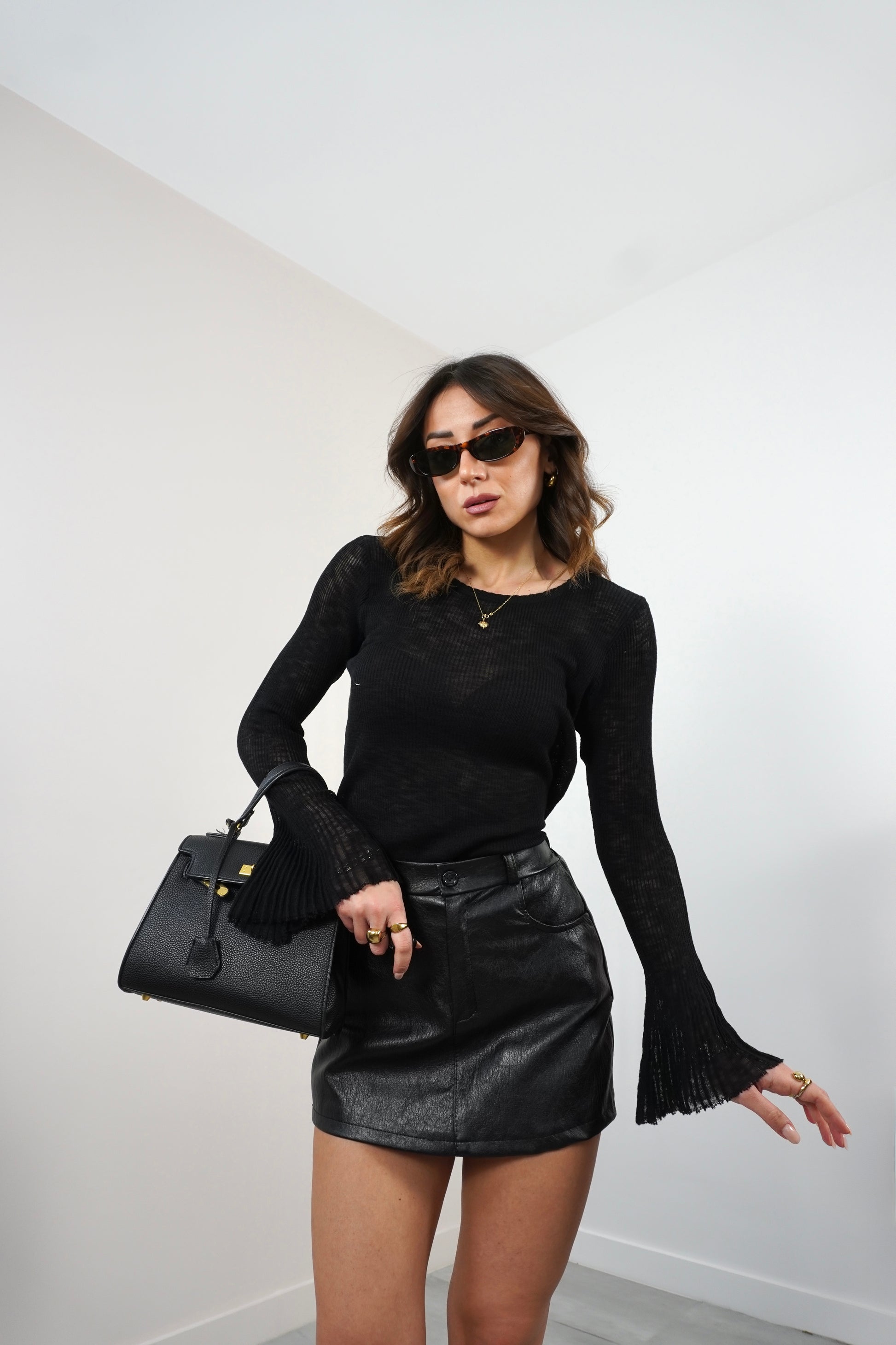 Maglia girocollo semi trasparente con manica a tulipano.