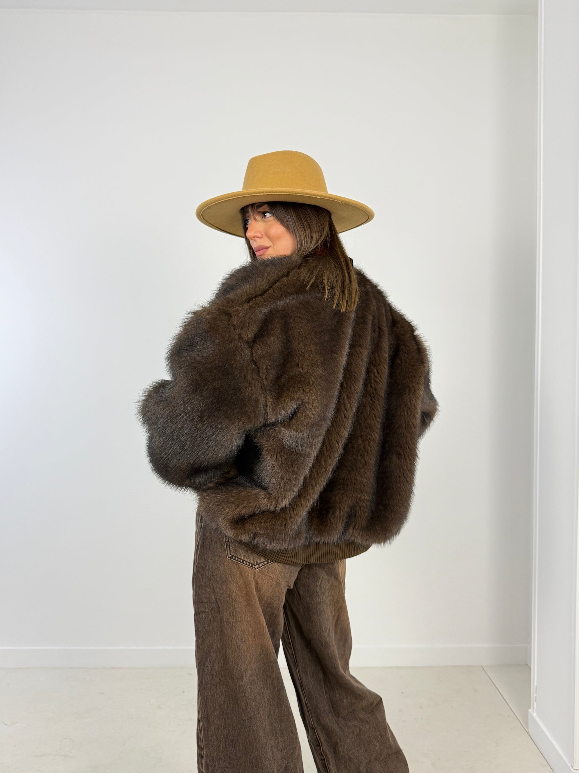 Pelliccia sintetica con scollo e bordatura in maglia a coste.