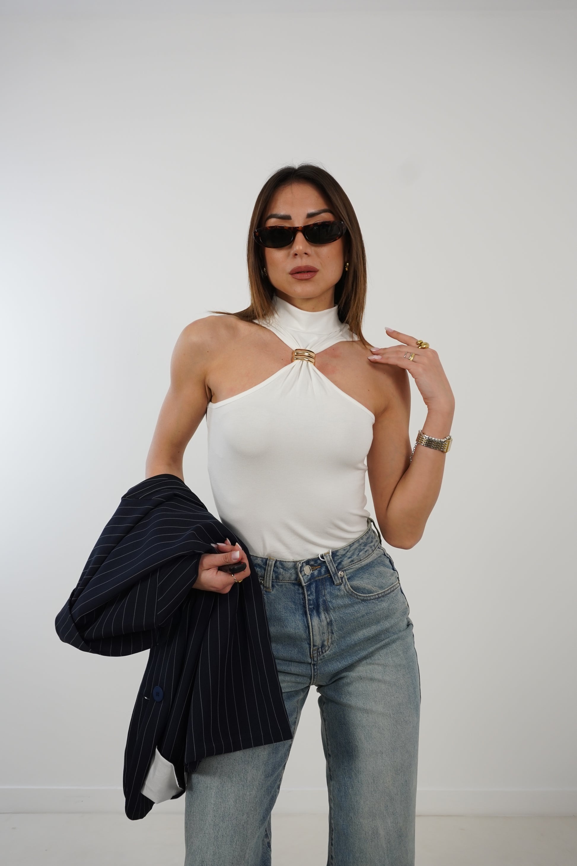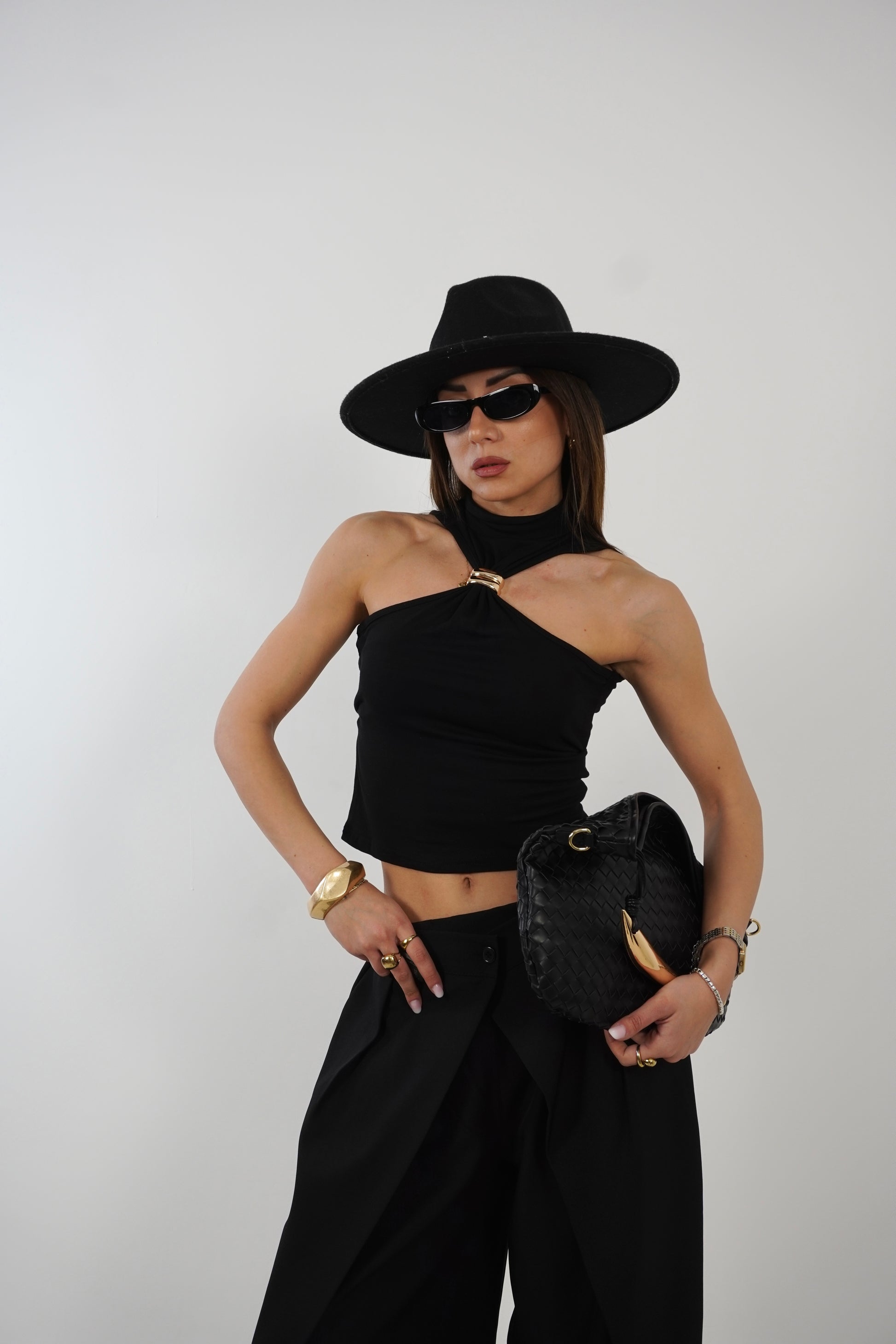 Crop top con scollo alla greca e dettaglio dorato. Possibilità di indossarlo al contrario.