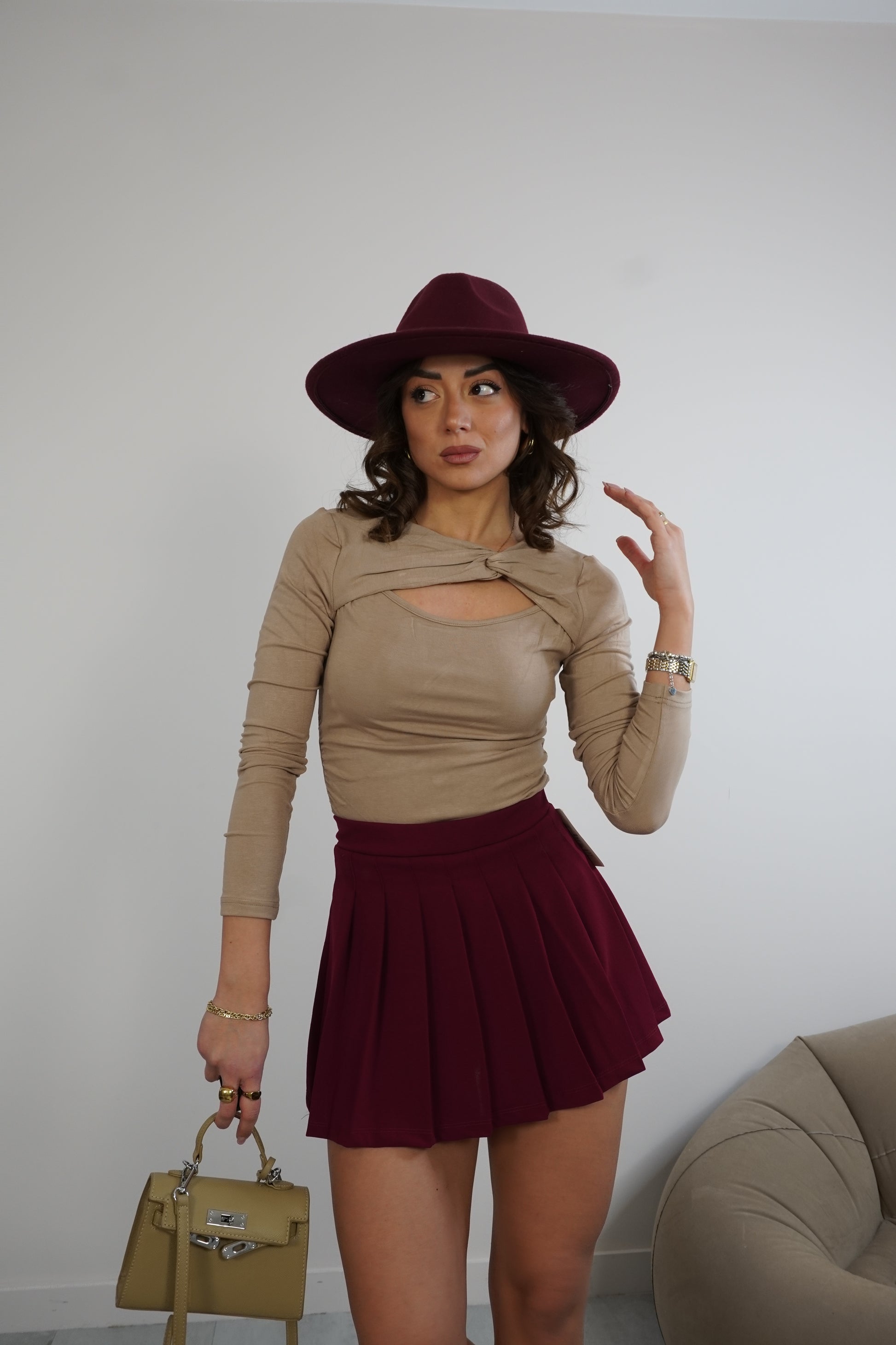 Top a manica lunga con nodo anteriore e scollo a goccia.