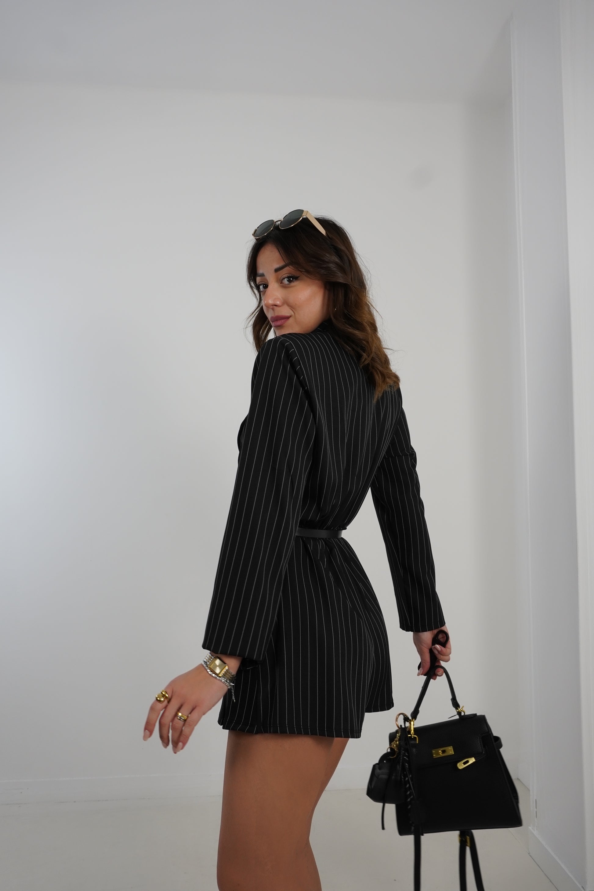Tutina gessata modello blazer con cintura in vita inclusa.